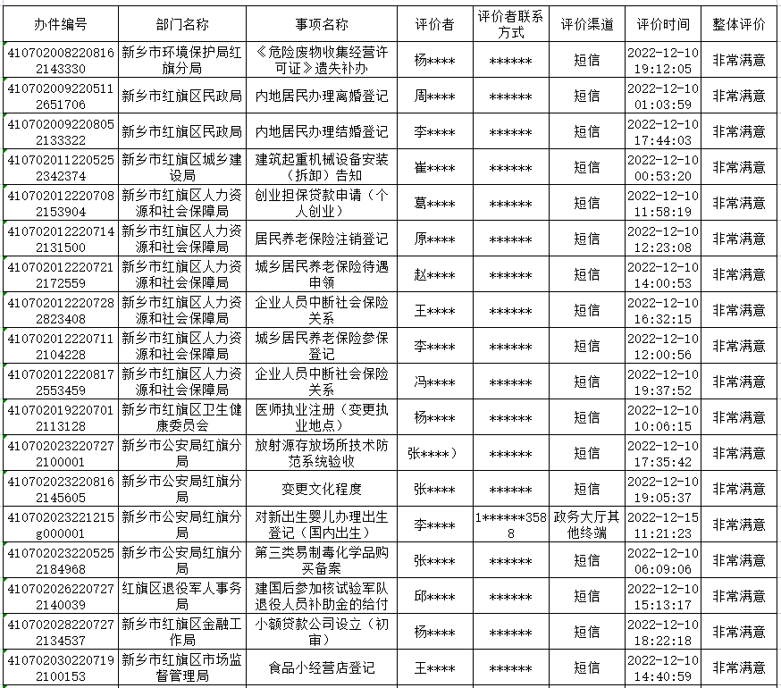 為主動接受社會群眾監(jiān)督,進(jìn)一步提升政務(wù)服務(wù)水平,現(xiàn)將全區(qū)2022年12月10日-12月16日政務(wù)服務(wù)“好差評”結(jié)果公示如下: